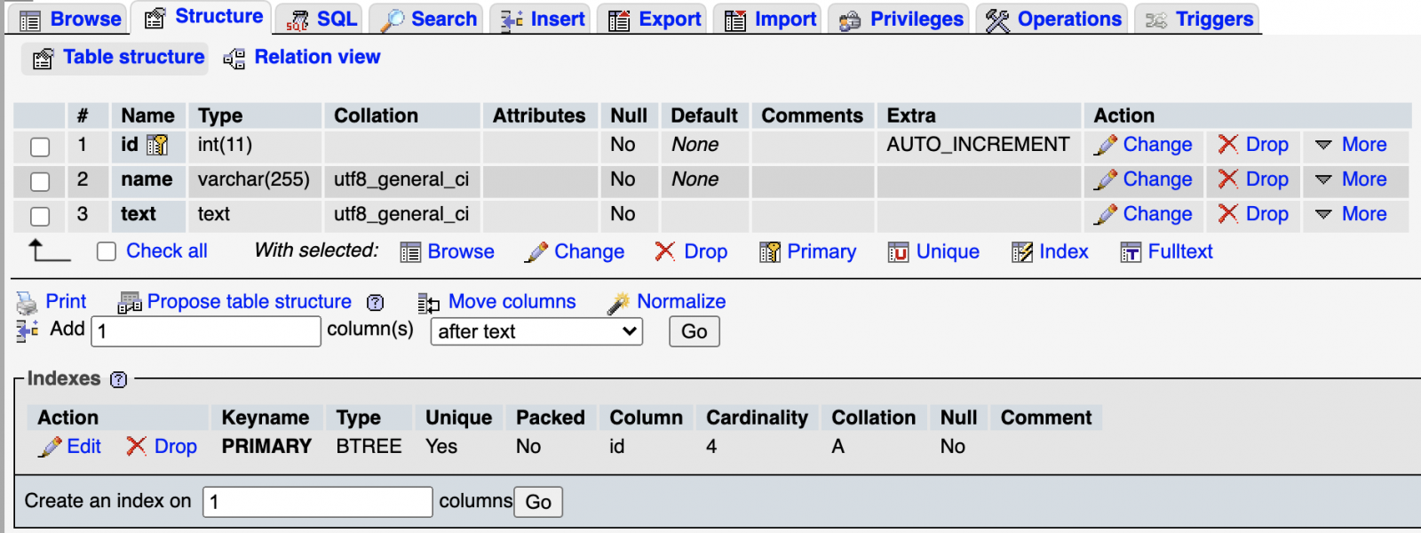$connection = \Illuminate\Database\Capsule\Manager::connection();Далее рассмотрим примеры вставки данных в таблицу в базе данных. В примере будет рассматриваться таблица со следующей структурой: