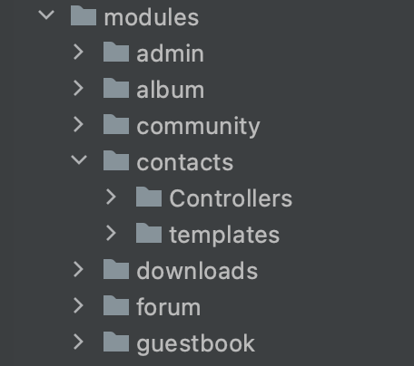 Внутри папки modules/contacts создадим подпапку templates для шаблона нашей страницы. Так же создадим папку Controllers для контроллеров. После выполнения этих действий у вас должна получиться такая структура: