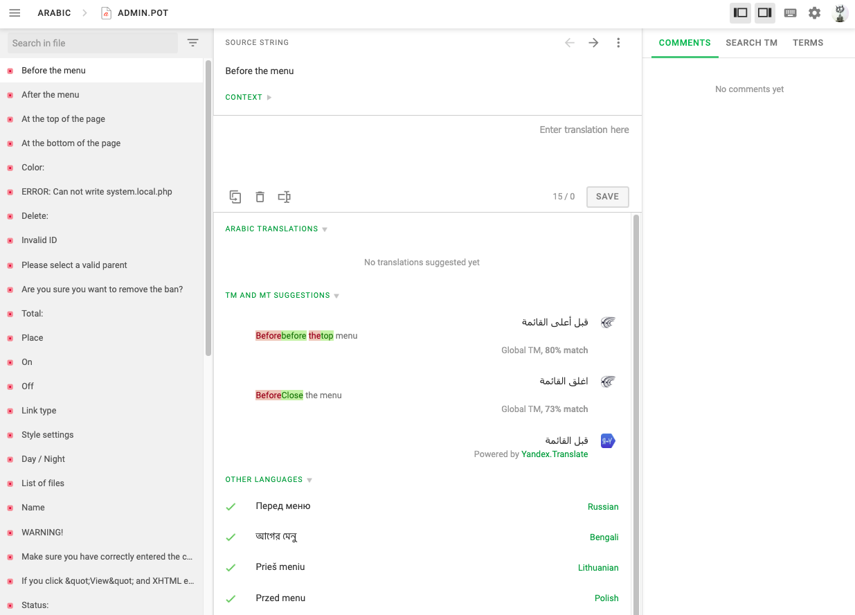 В левой части отображается список фраз для перевода. В центре отображается сам перевод и информация о том, в каких файлах содержится фраза (context). Так же вы можете посмотреть как эта фраза переведена на другие языки, для этого разверните блок OTHER LANGUAGES. Так же есть уже автоматически переведенные варианты (TM and MT Suggestions), которые вы можете выбрать если там есть подходящий вариант. Если подходящего варианта в автоматических переводах нет, то нужно вписать перевод вручную в поле ввода и нажать Save (сохранить). После сохранения автоматически откроется следующая фраза для перевода в текущем модуле.