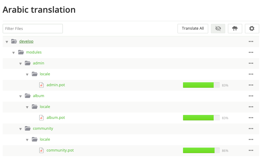 На этой странице отображен список переводов для модулей системы и процент фраз, которые уже переведены.