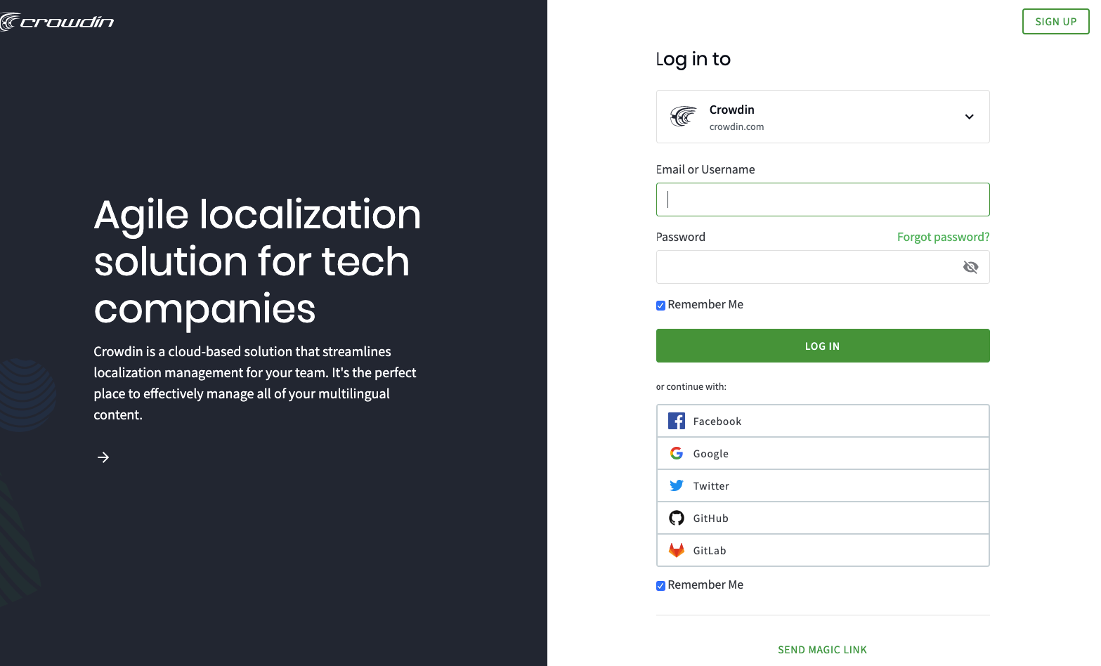 Вам необходимо авторизоваться на сайте. Если у вас уже есть учетная запись на crowdin.com или вы зарегистрированы в Facebook, Google, Twitter, Github или Gitlab, то можете нажать на кнопку Log in. Перед вами появится окно авторизации в котором вы можете ввести логин и пароль от учетной записи или войти через описанные выше сервисы. Если учетной записи нет, то нажимаете на Sign up и регистрируетесь.