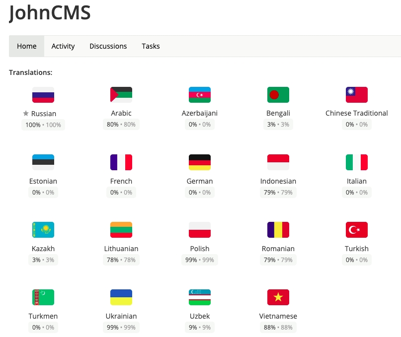 JohnCMS является мультиязычной CMS. К сожалению разработчики не знают всех языков, которые существуют на планете и для того чтобы система оставалась мультиязычной, необходимо чтобы люди, знающие другие языки, помогали с переводом. Мы постарались максимально упростить процесс перевода системы на другие языки. Для того, чтобы перевести систему на другой язык, нет необходимости обладать специальными навыками программирования. Перевод осуществляется непосредственно в браузере и может быть выполнен любым желающим.